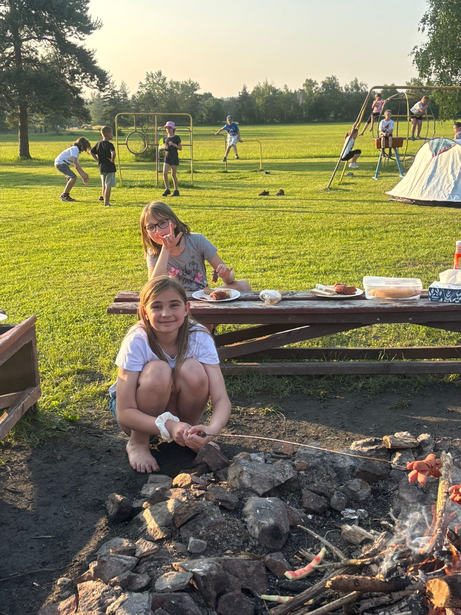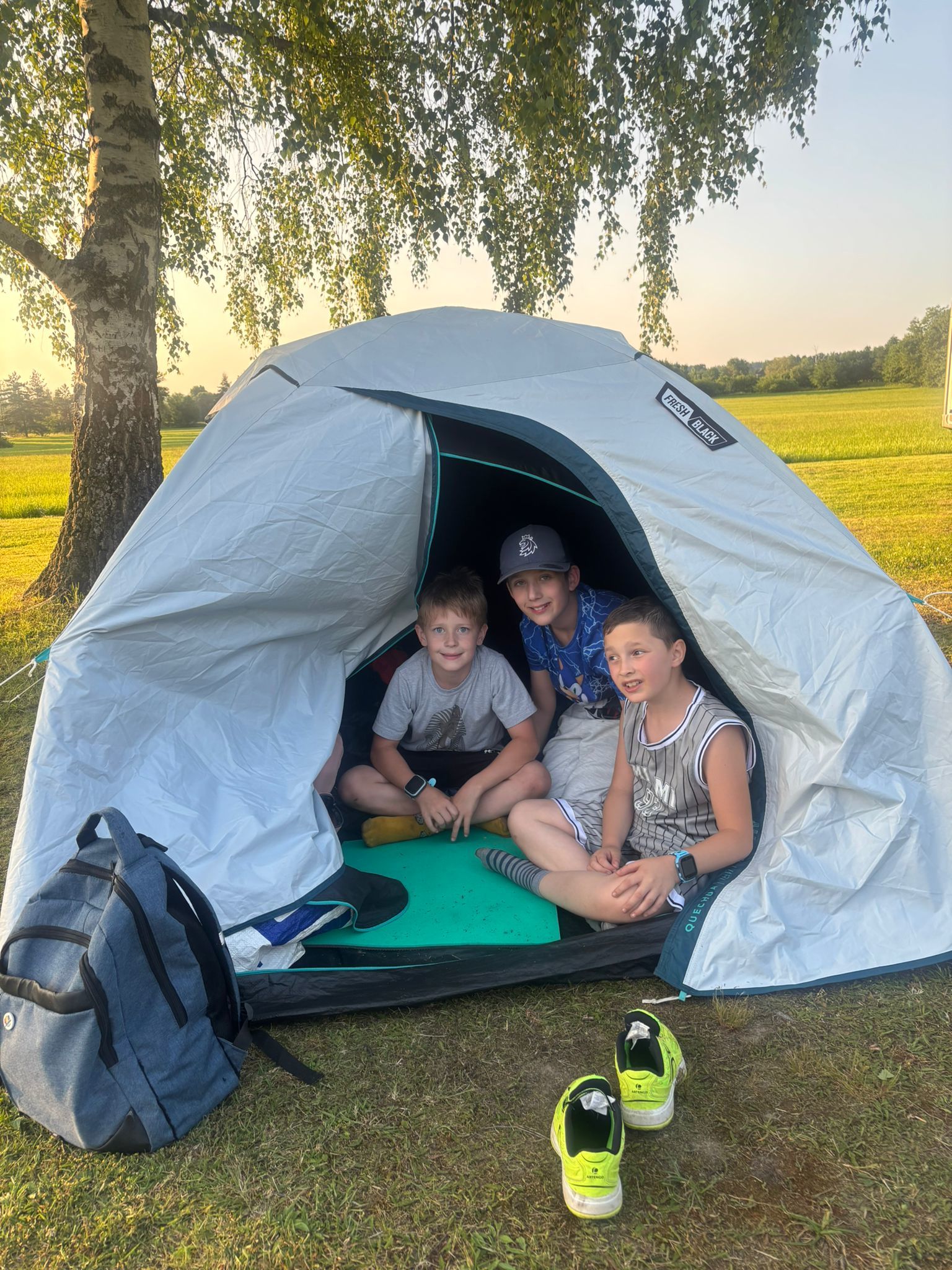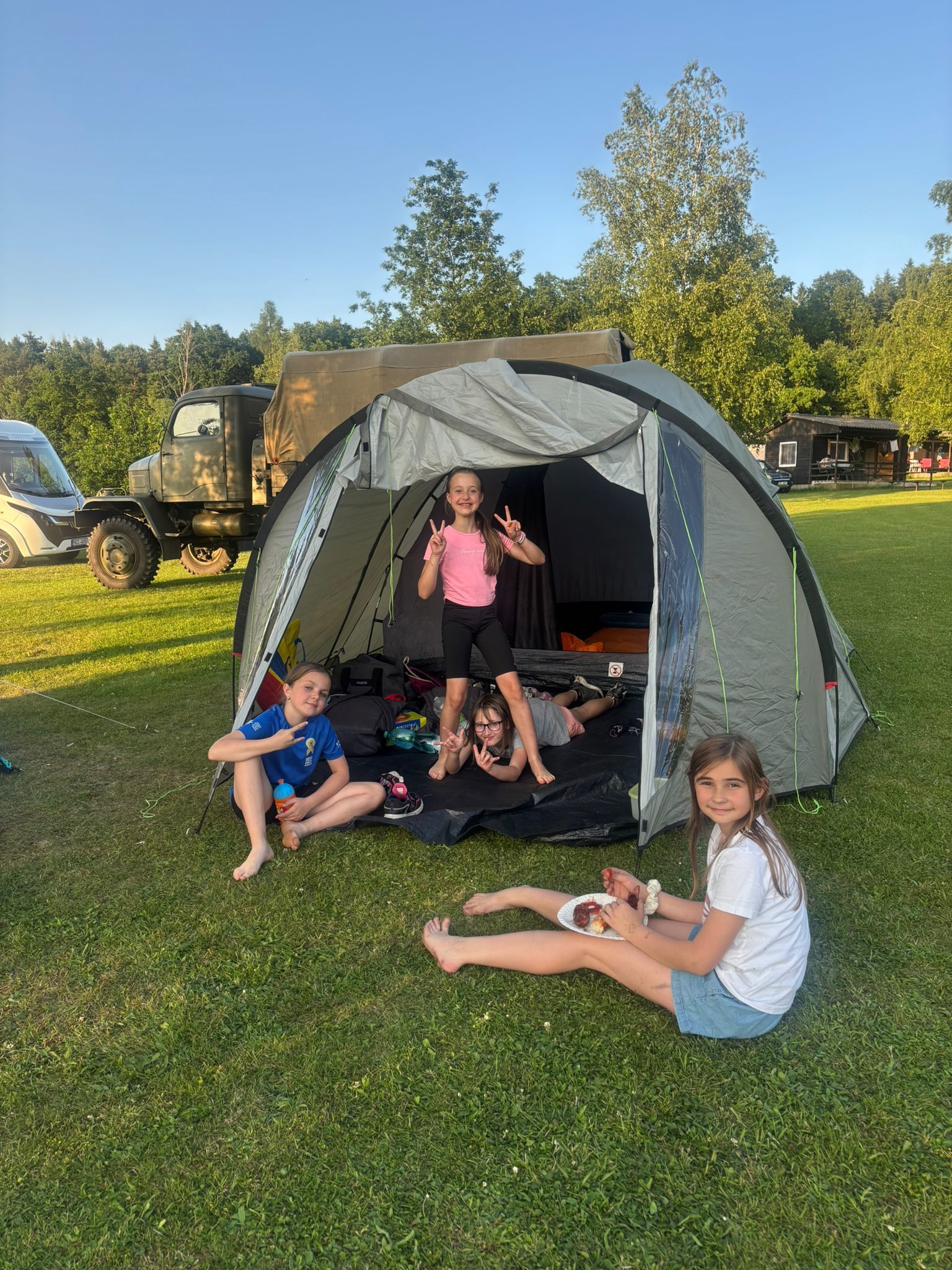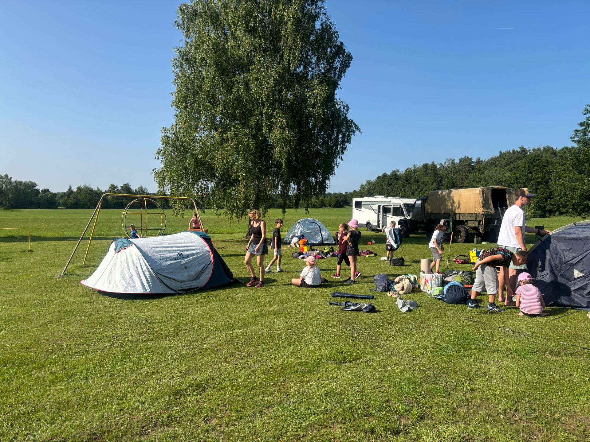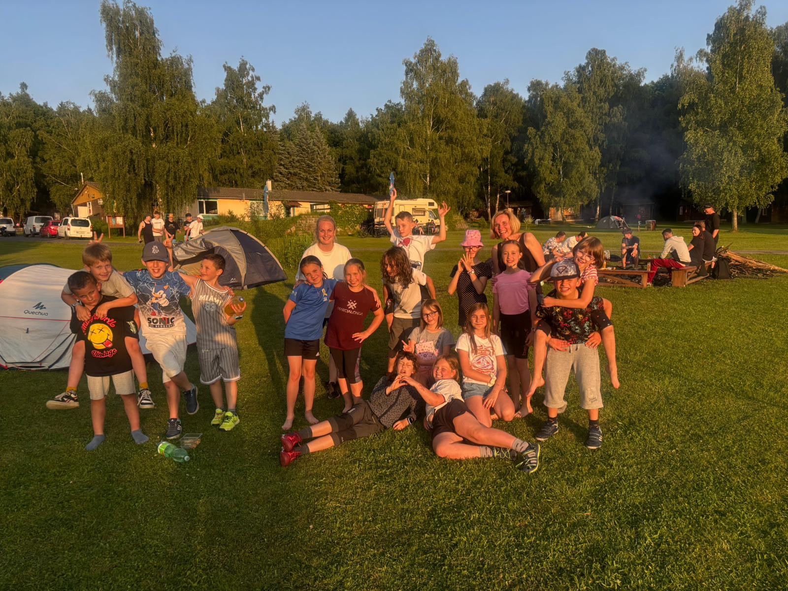Ve čtvrtek 12.6. jsme se po vyučování opět setkali u školy. Tentokrát jsme však tašky s učebnicemi nechali doma a ke škole si donesli stany, spacáky a karimatky. Pouze s batůžky na zádech jsme se vydali pěšky po cyklostezce až do kempu. Ostatní zavazadla, se nám mezitím vezla autem. Sluníčko nám na cestu příjemně svítilo. Po hodině a půl jsme dorazili do kempu a naším úkolem bylo postavit strany. Některé skupinky si vedly skvěle, u jiných bylo potřeba se stavbou pomoci. Ruce k dílu přidali i ochotní tatínkové s maminkami, kteří za námi také přijeli.