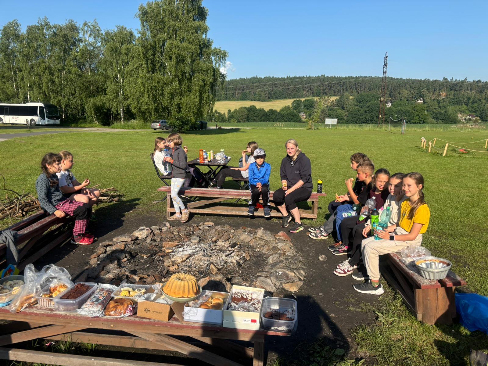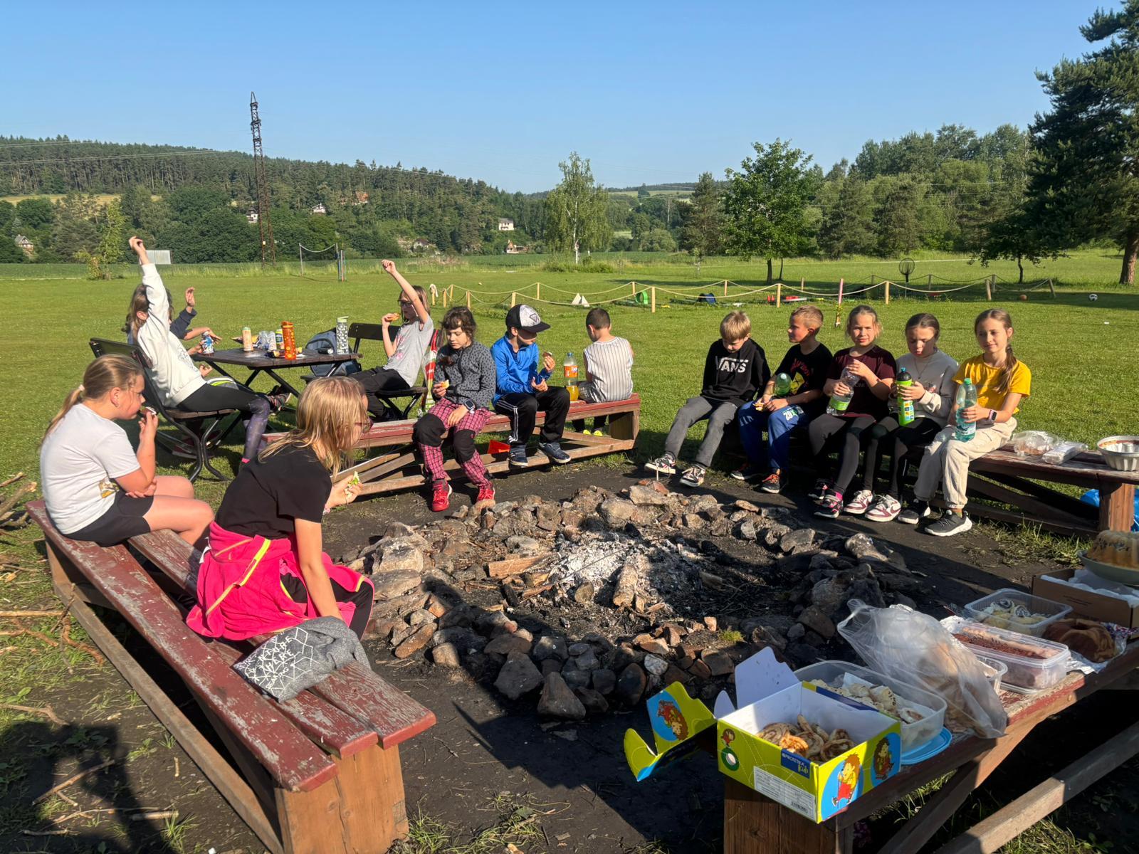 Nastal čas večeře, a tak bylo potřeba dojít do lesa pro dříví a připravit ho na oheň. Opečené buřty nám tak po práci ještě více chutnaly. V průběhu večera jsme hráli různé hry především však fotbal.